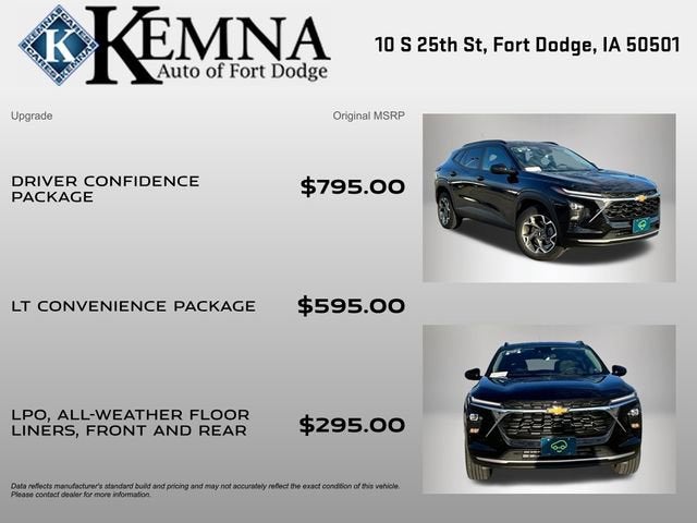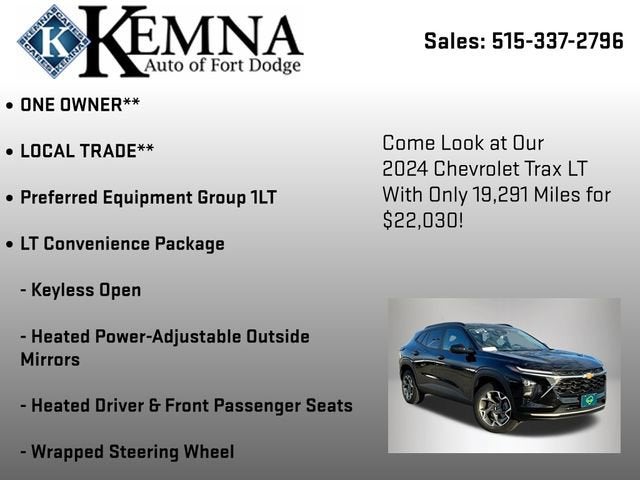 Discover the perfect balance of style, technology, and capability with the 2024 Chevrolet Trax LT. This sleek and versatile SUV is ready to elevate your driving experience, offering a dynamic blend of features that cater to your every need.- ONE OWNER**- LOCAL TRADE**- LT CONVENIENCE PACKAGE (Includes Keyless Open, Heated Driver and Front Passenger Seats, Heated Steering Wheel, Wrapped Steering Wheel, and Heated Power-Adjustable Outside Mirrors)- DRIVER CONFIDENCE PACKAGE (Includes Adaptive Cruise Control, Lane Change Alert with Side Blind Zone Alert, Rear Cross-Traffic Alert, and Rear Park Assist)- Preferred Equipment Group 1LTStep into the sophisticated cabin of the Trax LT and be captivated by the premium features that surround you. The heated steering wheel and heated front seats provide unparalleled comfort, while the Keyless Open feature ensures convenient access to your vehicle. The Lane Change Alert with Side Blind Zone Alert and Rear Cross-Traffic Alert keep you aware of your surroundings, while the Rear Park Assist helps you navigate tight spaces with ease.Beneath the sleek exterior lies a dynamic powertrain that delivers an impressive blend of performance and efficiency. The 1.2L Ecotec Turbo DOHC DI engine, paired with a 6-Speed Automatic transmission, provides a seamless and responsive driving experience, with an EPA-estimated 28 MPG in the city and 32 MPG on the highway.Versatility is at the heart of the Trax LT, with a spacious interior that can adapt to your ever-changing needs. The split-folding rear seats and ample cargo space allow you to easily accommodate your gear, whether you're embarking on a weekend adventure or tackling your daily commute.Safety is also a top priority in the Trax LT, with a comprehensive suite of advanced safety features. Dual front impact airbags, dual front side impact airbags, and an overhead airbag provide protection in the event of a collision, while the 4-Wheel Disc Brakes and Electronic Stability Control help you maintain control in challenging driving conditions.Experience the exceptional value and uncompromising quality of the 2024 Chevrolet Trax LT. Visit our showroom today and let us demonstrate how this versatile SUV can enhance your driving experience and exceed your expectations.